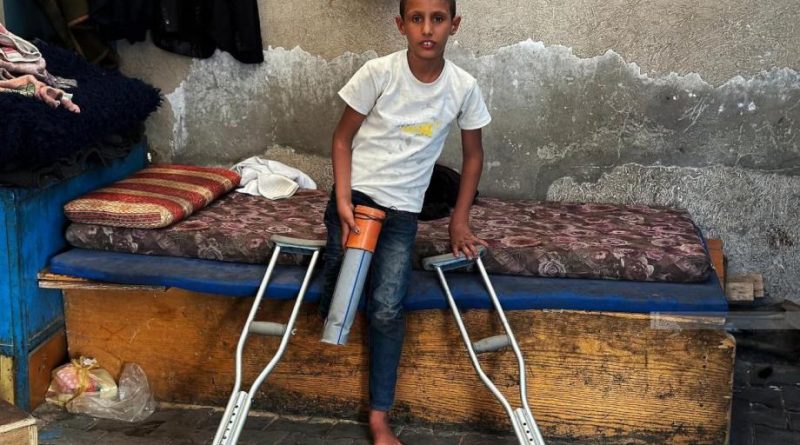 في مشهد يختصر وجع الطفولة في غزة، شوهد الطفل راتب اقليق (10 أعوام) وهو يركل كرة بلاستيكية بماسورة صرف صحي، يستخدمها كطرف صناعي بديل عن ساقه التي بترها قصف جيش الاحتلال الاسرائيلي قبل أشهر.